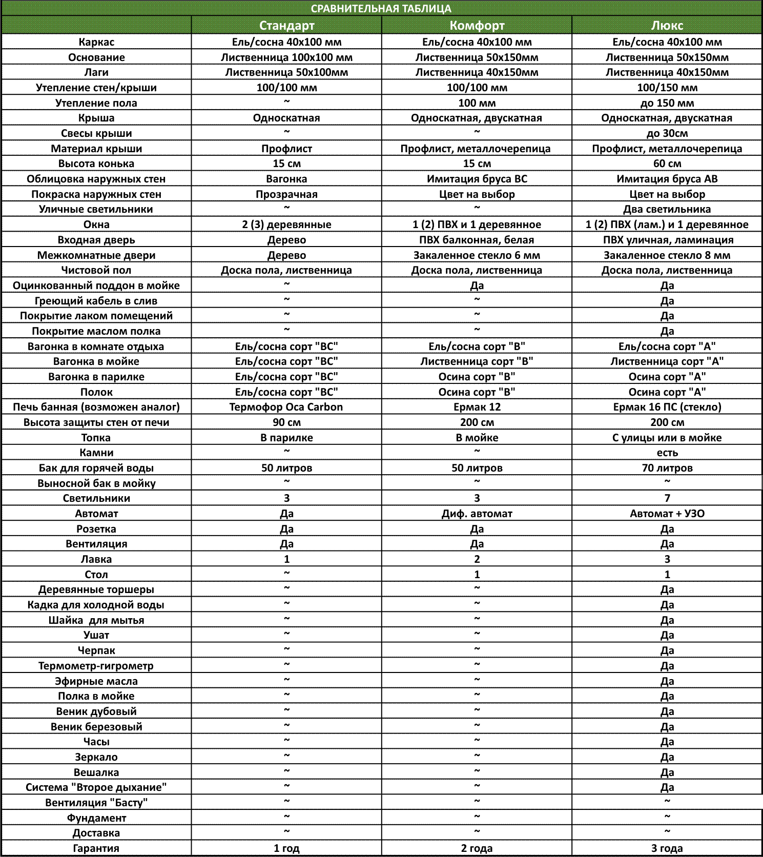 | Размер | Стандарт | Комфорт | Люкс |
